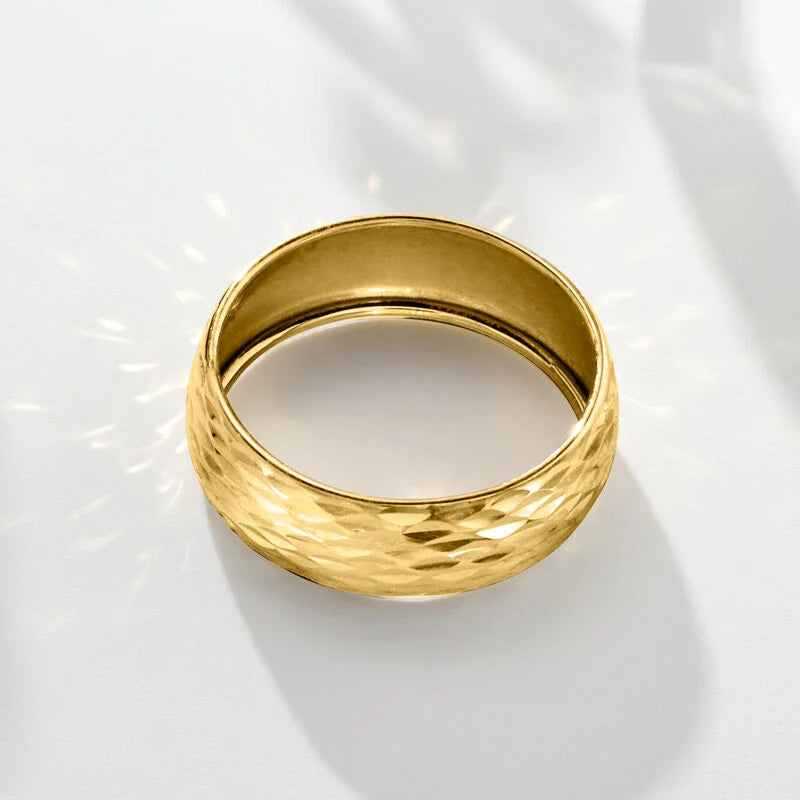 Shimmer and shine while wearing this pretty ring from Italy! Crafted of gleaming 14kt yellow gold, the unique sparkle pattern makes a statement with any look. 1/4" wide. Sparkle pattern ring.